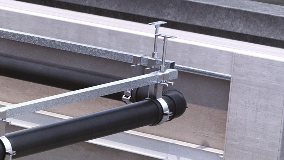 緊固件系統是針對HDPE管應用于虹吸系統特殊安裝要求而開發。虹吸式屋面雨水排放系統懸吊管內呈負壓狀態,為避免系統漏氣,系統不設置伸縮節,宇順使用“固定安裝”限制管道的伸縮方式,將HDPE管溫度變化引起的軸向應力直接通過固定管卡固定點傳送到平行安裝的方形鋼管上。通過在雨水排放系統的實踐經驗,固定系統的最大工作溫差可達到50 ℃。
